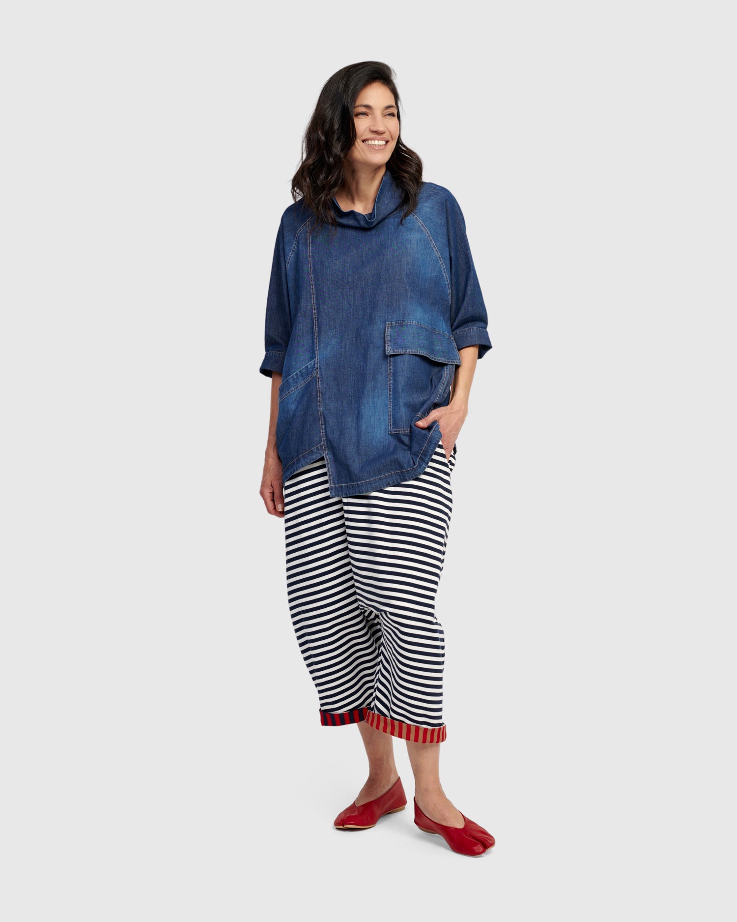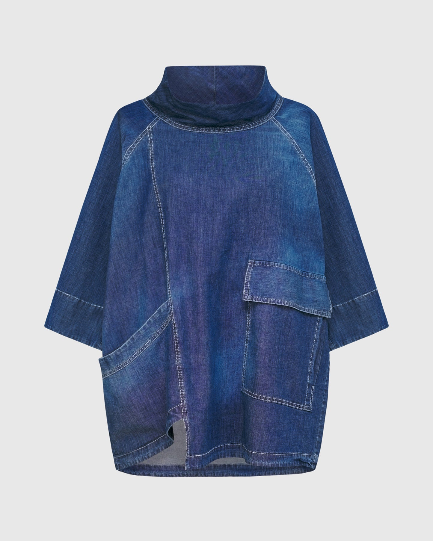 This easy oversized tunic is made in a lightweight denim women fabric and has a Cowl neck, three quarter length sleeves and side pockets. Oversized fit with for all-day comfort and mobility.