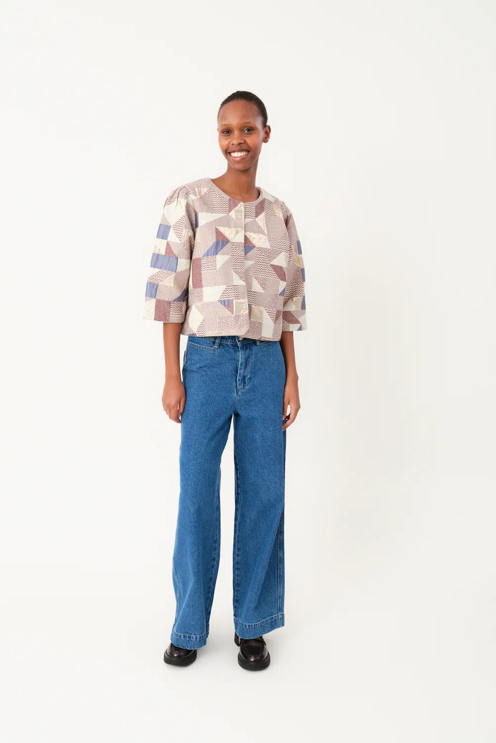 This unique jacket is designed in a beautiful fabric with patchwork-inspired patterns in soft cream, brown, gold, and dusty blue tones. The silhouette is boxy and cropped with wide 3/4 sleeves and a rounded neckline, making it perfect over a simple tee or styled with a skirt or jeans. A statement piece that brings something truly special to any outfit.