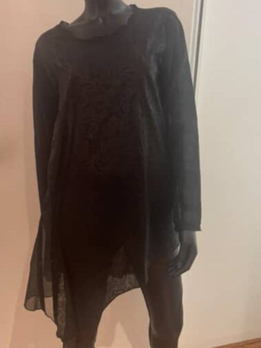 This beautiful layering piece from "Nu Denmark" in sheer embossed Black, is softly panelled and the perfect mate for some slim leg leather pants or a soft wide palazzo leg. Another option is to layer the piece over a slim dress.