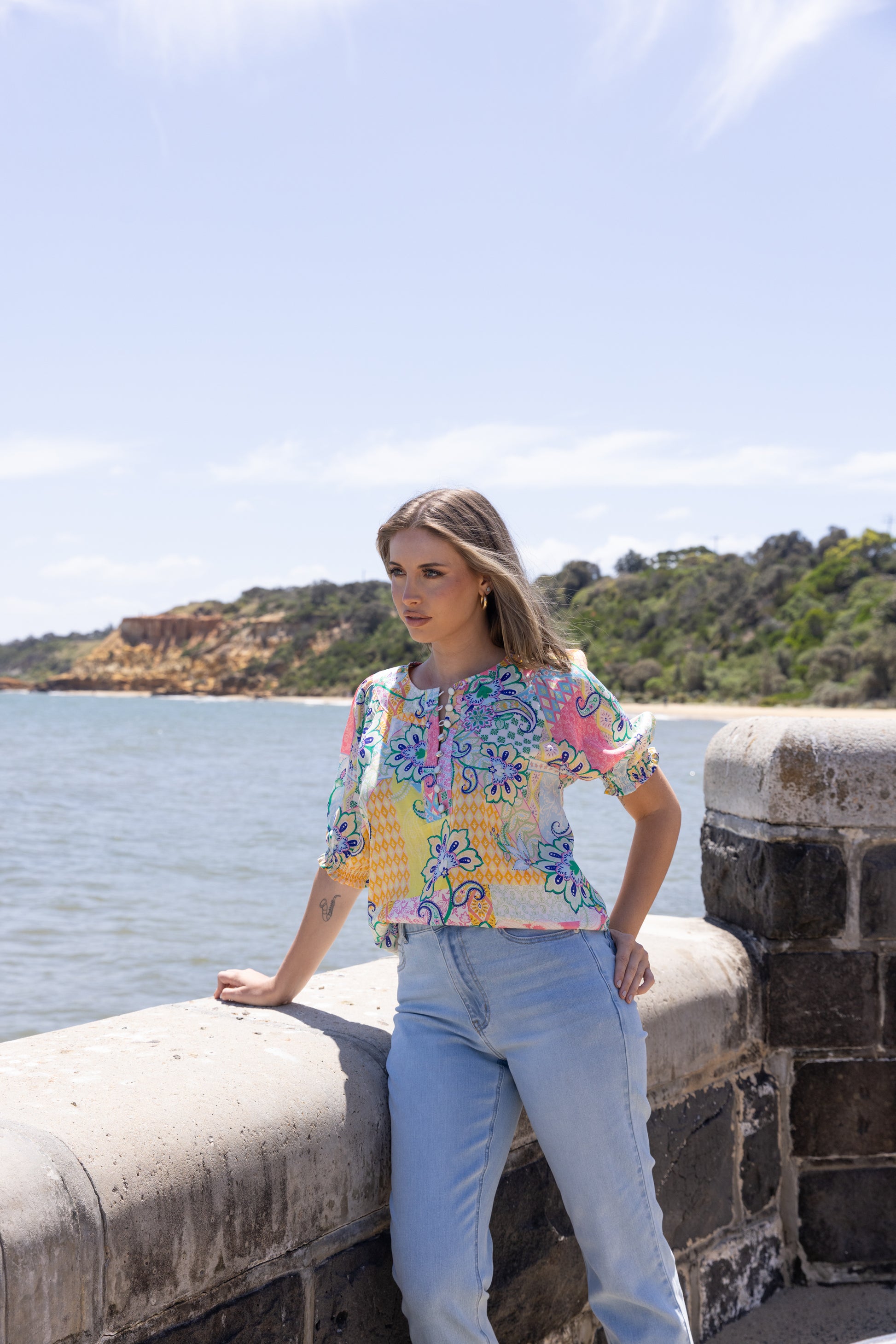 Meet your new go-to top! The Stella Print Top brings vibrant colour and effortless style with its lightweight fabric that's perfect for warm weather. Featuring a charming round neckline, playful short puff sleeves with elastic for a flattering fit, and an eye-catching button detail that adds personality. Whether you're dressing up or keeping it casual, this cheerful printed piece works beautifully with everything in your wardrobe.