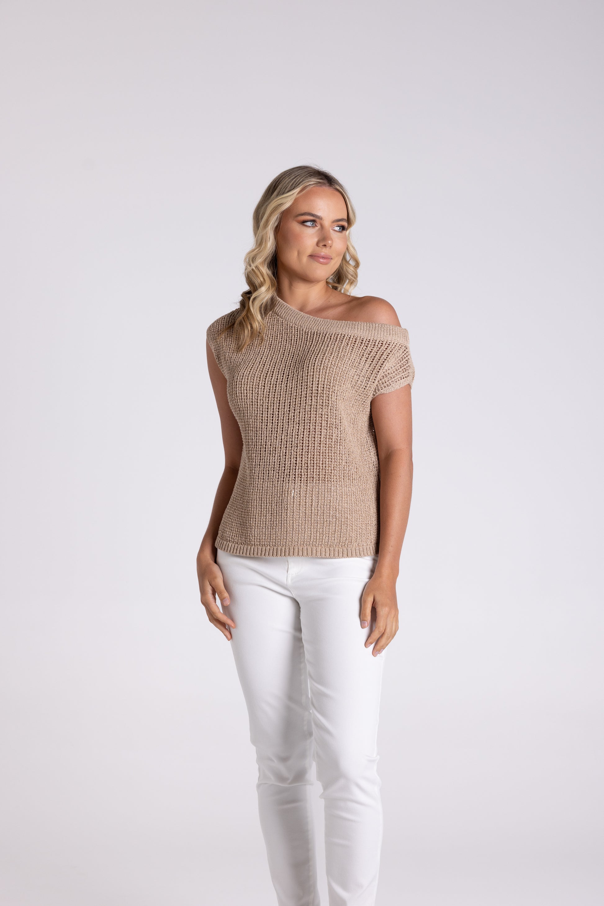 Two-T's Tape Yarn Boatneck Top - Sand - Sizes: XS S L
