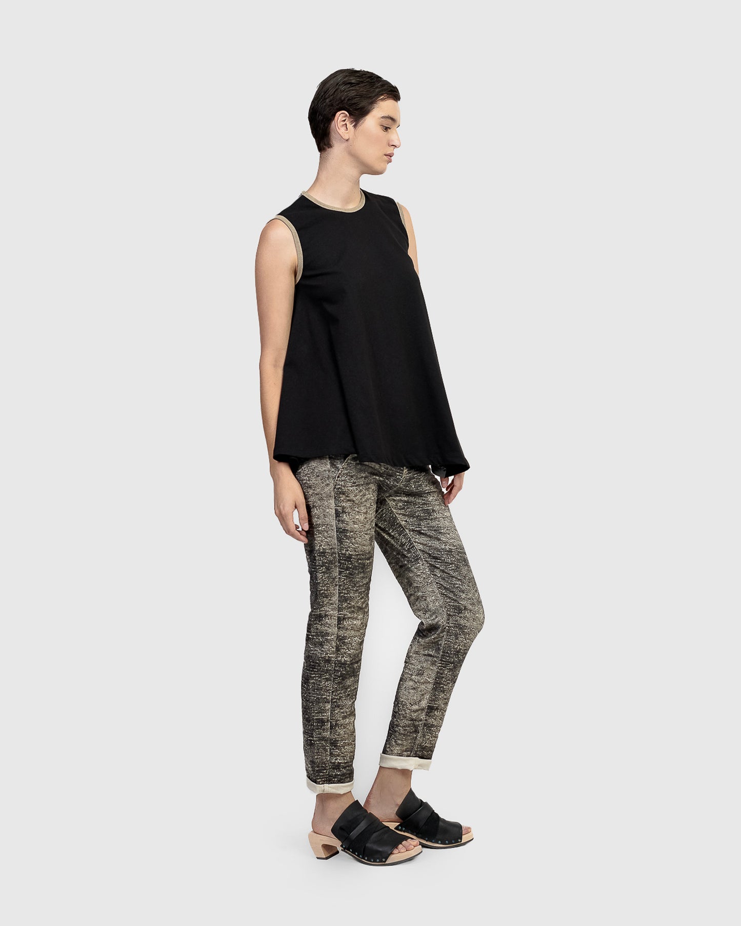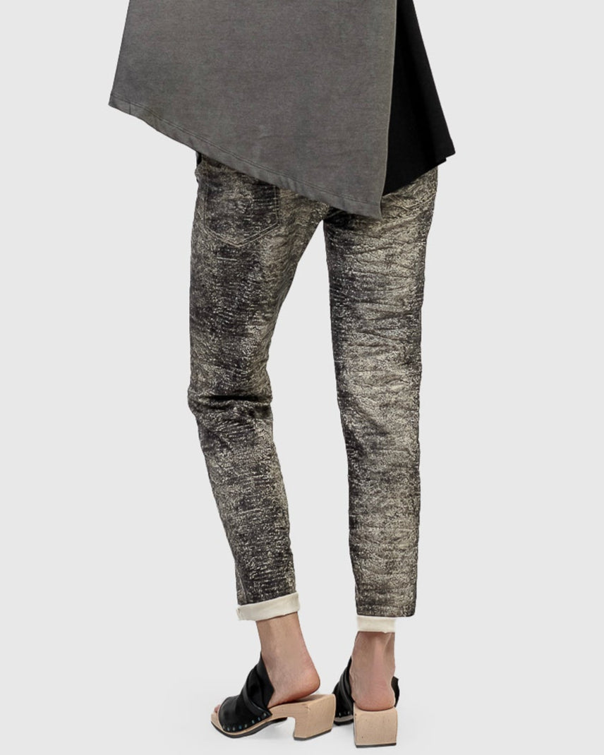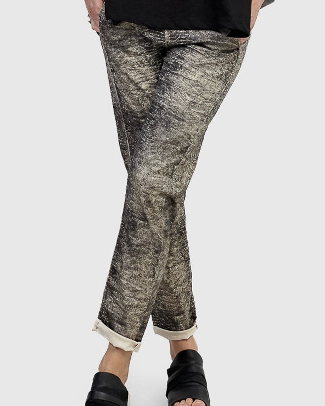 Our ultra-soft cult favorite is here in an earth-toned grunge print and made in a soft stretch cotton blend. Thanks to a flattering mid-rise waist and a more relaxed taper than skinny jeans, our beloved Iconic never feel skin-tight; just deliciously comfy. Drawstring stretch waist, mock fly, side pockets, yoked back with patch pockets, and rivet trim.