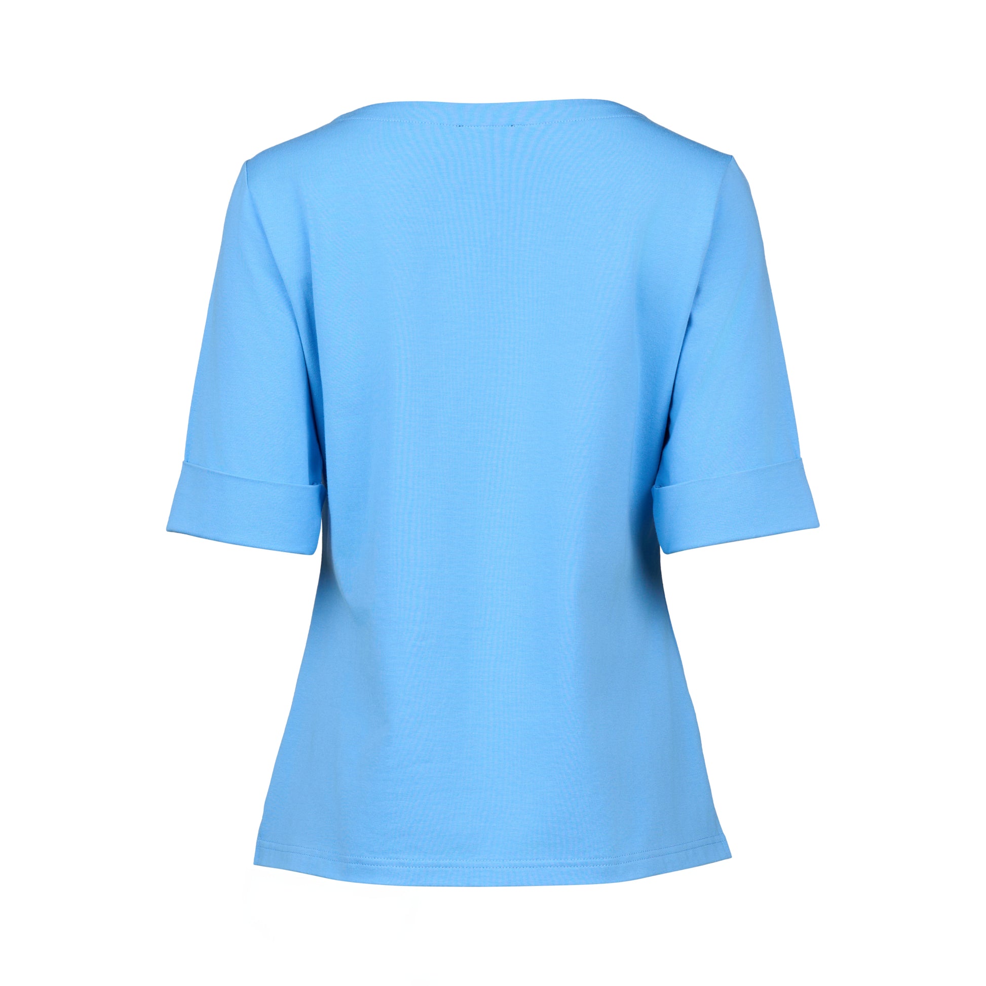 This sky blue boat-neck top is made from soft, stretchy cotton-elastane jersey for all-day comfort. It features short sleeves with turned-up cuffs, a relaxed fit, and side splits for easy movement.